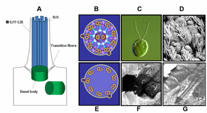 图一、鞭毛/纤毛的结构和类型。A,鞭毛/纤毛的结构,包括轴丝(Axoneme),鞭毛/纤毛膜(Ciliary membrane),与之相关的结构有基体(Basal Body)和Transition fibers。B,9+2型运动鞭毛/纤毛,如:衣藻的鞭毛(C)和呼吸道纤毛(D)。E,9+0型原纤毛,如肾表皮纤毛(F)和光受体细胞中连接纤毛(G)。(图A,D,F,G来源于Pedersen and Rosenbaum 2008 和Rosenbaum and Witman,2002.)