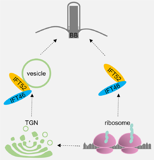图二、IFT46基体定位的模型。新合成的IFT46与IFT52在细胞质或者高尔基体上预组装成复合体经由囊泡或者非囊泡介导的途径定位于基体。