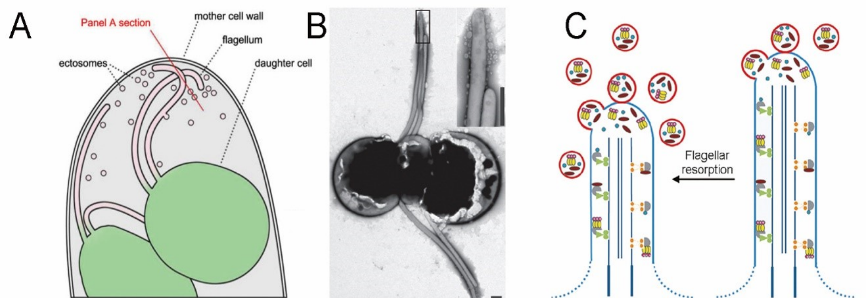 图三、纤毛的分泌功能存在于不同物种的纤毛中。A,有丝分裂过程中,衣藻纤毛分泌囊泡,其含有的活性蛋白酶用来降解母细胞壁,释放子细胞(Wood et al., 2013)。B,mating中的衣藻纤毛可从纤毛顶部分泌囊泡至胞外(Cao et al., 2015)。C,衣藻纤毛解聚过程中,纤毛囊泡的分泌量显著增加(Long et al., 2016)。