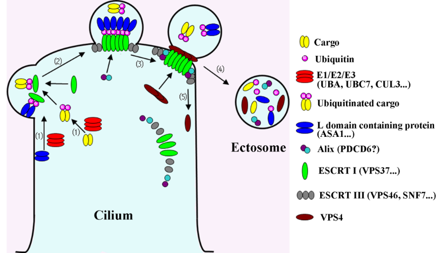本实验室在前期研究中成功分离纯化了衣藻在营养生长过程中分泌的纤毛囊泡,并对其蛋白组分与纤毛膜进行定量蛋白组学分析。证明纤毛囊泡虽然是从纤毛膜分泌至胞外,但它们具有特异的蛋白组分(Long et al., 2016)。其中富含蛋白水解酶、small GTPase、泛素化系统酶类等,此外,还含有3个ESCRT(内吞体运输分拣复合体,endosomal sorting complex required for transport)相关蛋白。通过进一步实验提出纤毛囊泡分泌的模型(图四):含有Late Assembly Domain的蛋白募集被泛素标记的蛋白、其他囊泡货物蛋白及ESCRT复合体蛋白,使ESCRT I复合体与纤毛囊泡的货物结合并在纤毛上形成一个膜突起,然后Alix/PDCD6与ESCRT I复合体结合并招募ESCRT II和ESCRT III,形成budding neck,最后VPS4复合体切断budding neck,使纤毛囊泡脱离纤毛膜。