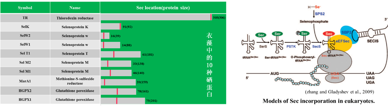 图五、衣藻中的10种硒蛋白及真核生物中硒蛋白的合成机理