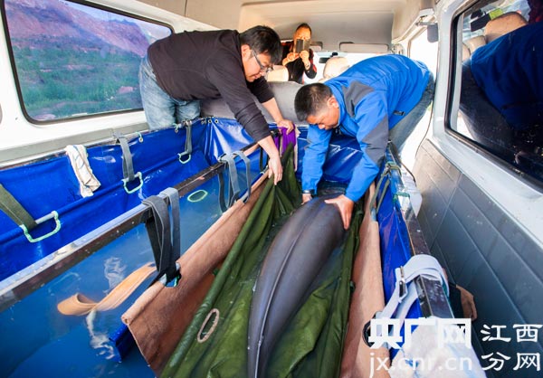 3月24日,在鄱阳湖都昌城西码头,中科院水生生物研究所工作人员在作江豚迁运准备工作。