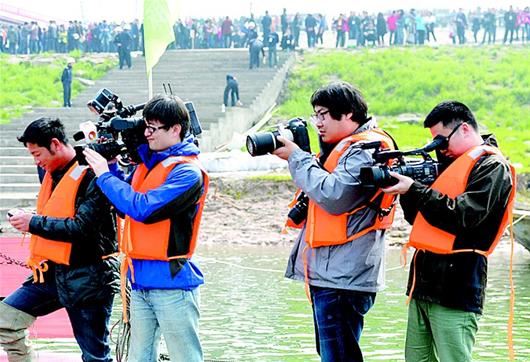 图为:媒体聚焦江豚“搬家”。