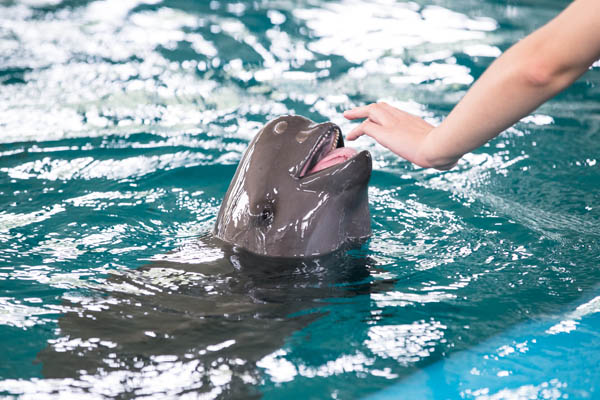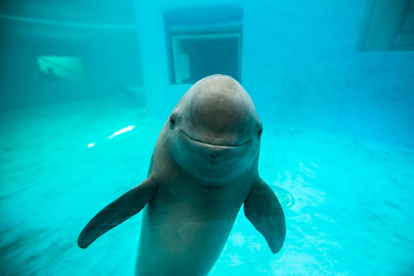 上周,第一财经记者随H&M与WWF(世界自然基金会)合作的长江江豚保护实地考察计划,来到湖北。到达武汉白鱀豚馆的时候正值中午,赶上了江豚的午饭时间,它们一天四餐,严格控制体重。或许是听到饲养员的脚步声,4头体长1米多的江豚迅速搅起水花,欢腾地在池边等待开饭。它们全身铅灰色、头部钝圆、吻部很短,看上去嘴角总是含着笑,很是可爱。虽然动作灵活,但身躯圆滚滚的,探出水面时就像一头头小猪,怪不得渔民称它们“江猪(子)”。