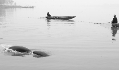 给江豚体检很不容易,渔民先将江豚围住,逐渐缩小包围圈,确保江豚安全才能捕捞上岸(高宝燕 摄)