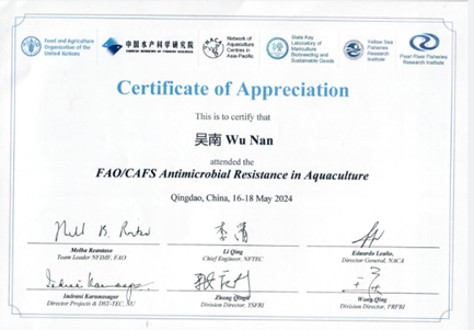 联合国粮农组织颁发的水产养殖抗微生物耐药性培训证书