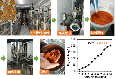 成果简介:目前,市场上天然虾青素主要来源于光自养培养的雨生红球藻和红法夫酵母。微藻来源的虾青素为左旋结构,在细胞内主要以酯化形式存在,抗氧化活性优于红法夫酵母来源虾青素(主要为右旋游离虾青素)和化学合成虾青素(内消旋虾青素)。化学合成虾青素因其安全性问题主要用于水产品着色,红法夫酵母主要作为饲料添加剂应用在饲料上。尽管雨生红球藻细胞内虾青素含量高(2-4%),但其存在着光自养培养下生物量浓度低(0.5-2g/L)、规模化培养生产不稳定(受季节和地域限制)、后处理成本高、产能低和生产成本高等问题。佐夫色绿藻被认为是最有可能替代雨生红球藻进行天然虾青素商业化生产的新型微藻资源,异养高密度生长条件下较低的虾青素含量成为制约该藻商业化应用的瓶颈。本成果针对当前佐夫色绿藻异养培养条件下虾青素含量低、高效虾青素发酵生产工艺尚未建立的现状,通过实验室适应性进化的方法筛选获得了一株可异养培养的高产虾青素小球藻突变藻株,并建立了相应的异养高密度培养和虾青素高效积累工艺,和雨生红球藻一样,其虾青素结构同为左旋型虾青素,在细胞内主要以酯化形式存在。但其可以在异养暗培养下高密度培养。我们通过系列发酵条件优化,建立了其异养高密度培养和虾青素高效积累工艺,500L发酵罐培养下生物量浓度高可达到200g/L以上(高于红法夫酵母),虾青素含量可稳定在0.2-0.3%(含量和红法夫酵母相当),单位体积虾青素产量远高于雨生红球藻,为佐夫色绿藻在饲料和食品等领域的商业化开发利用提供了技术基础。