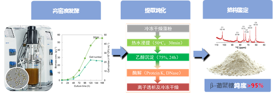 成果简介:β-1,3-葡聚糖是一类广泛分布于高等植物、细菌、真菌和藻类中的活性多糖,具有包括提高机体免疫力在内的数十种功效,被广泛应用于医药保健、食品、化妆品和动物饲料等行业。谷物和酵母是商业化β-1,3-葡聚糖的主要生产来源,但这些细胞壁来源β-1,3-葡聚糖存在含量低(1-7%)、提取工艺复杂、分子量大(>200 kDa)、水溶性差等缺点,有待开发新型β-1,3-葡聚糖资源。本成果筛选获得了一株富含β-1,3-葡聚糖的棕鞭金藻,通过实施一系列的发酵过程优化和控制,建立了该藻的异养高密度培养和β-1,3-葡聚糖高效积累工艺,500L发酵罐中试放大下最高生物量浓度可稳定在40-50 g/L,胞内β-1,3-葡聚糖含量可达细胞干重的50%以上。核磁共振分析结果表明,金藻β-1,3-葡聚糖中95%以上都是β-1,3结构,分支结构很少;凝胶渗透色谱结果表明,金藻β-1,3-葡聚糖的分子量较低(-16.7kDa),不到酵母β-1,3-葡聚糖的1/10,因而其水溶性更高;进一步生物活性评价结果表明,金藻β-1,3-葡聚糖具有促进斑马鱼尾鳍再生和提高机体抗氧化能力的功效,且其对尾鳍再生的促进效果优于商业化酵母β-1,3-葡聚糖。本成果技术为低分子量、高水溶性β-1,3-葡聚糖的经济、高效生产提供了一种新资源和新途径。