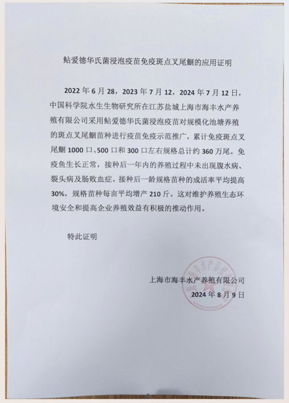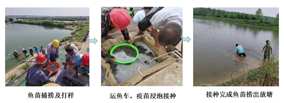 成果介绍:创制鲇爱德华氏菌浸泡疫苗,其一次浸泡接种可高效防控鲇形目鱼类(黄颡鱼、斑点叉尾鮰等)的肠败血病和裂头病,将一龄苗种的成活率提高约30%,一龄苗种平均每亩增产210斤。在30分钟内一辆运鱼车即可完成50-70万尾鱼苗浸泡接种。产生的相对保护率高达90%以上(以20倍半致死剂量攻毒)。具有接种应激小,疫苗与接种成本低(3-5分钱/尾),保护效率高的特点。