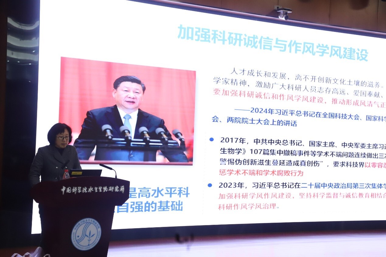 党务办公室负责人刘力作了题为《弘扬科学家精神,坚守科研诚信》的专题报告。她结合大量案例,深入阐述了科研诚信的重要性,围绕实验记录和论文发表详细讲解了研究生应遵守的科研诚信要点,并对实验记录中常见问题进行诚信提醒。通过展示老科学家严谨治学的手稿,勉励同学们弘扬科学家精神,勇于创新、坚守诚信,从入学伊始就筑牢学术自律的根基,规范学术行为。