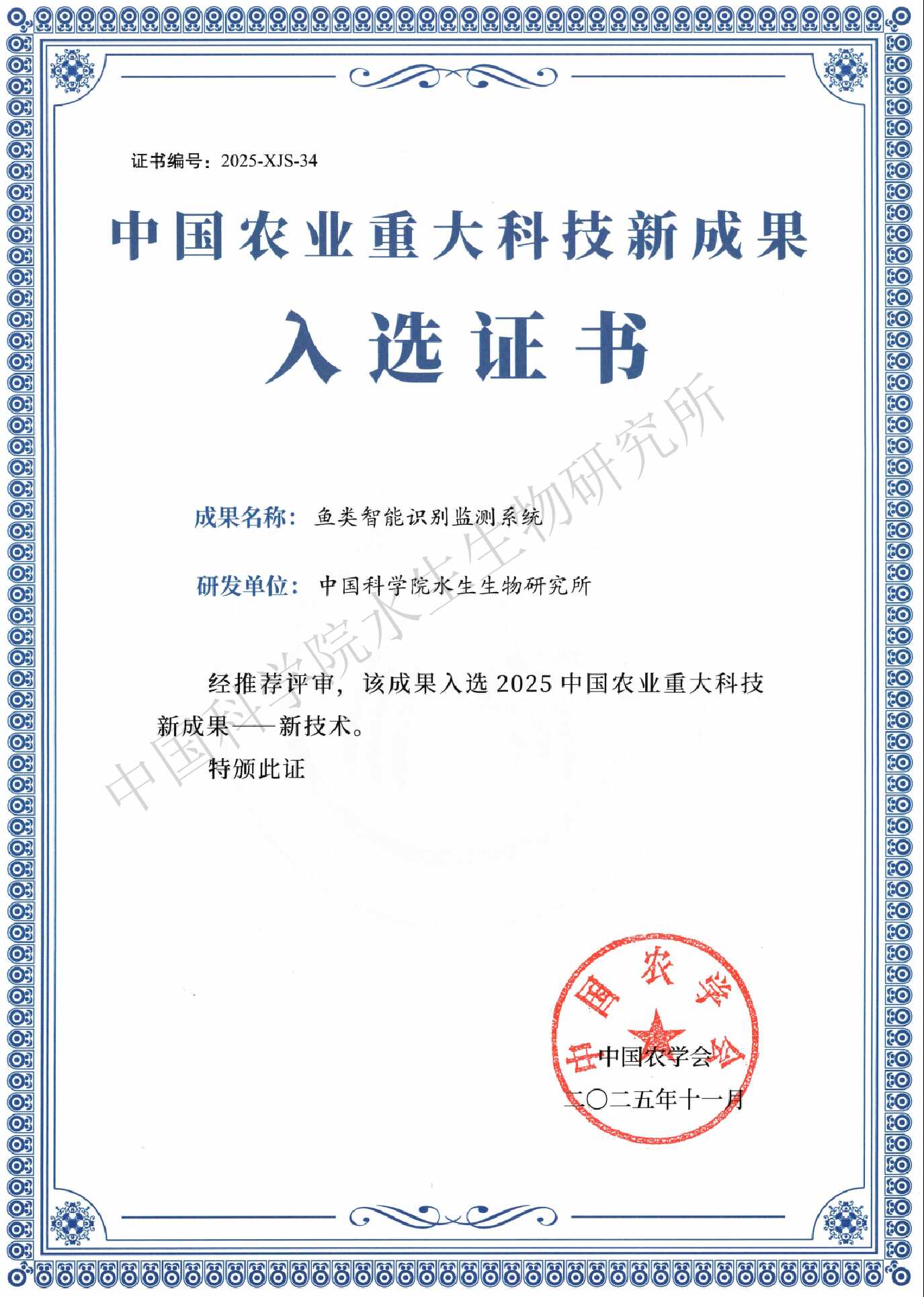 近日,中国科学院水生生物研究所渔业智能技术与装备研究团队科技成果“鱼类智能识别监测系统”入选2025中国农业重大科技新成果,相关产品亮相2025湖北省农业博览会。