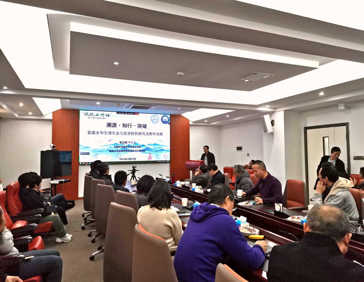 3月27日,2026年第一期“饶钦止讲坛”在中国科学院水生生物研究所举行。宋立荣研究员应邀作了题为“溯源·知行·突破:蓝藻水生生理生态与危害防控研究及野外实践”的报告。作为我国淡水藻类学研究的重镇,水生所自上世纪三十年代起便开启了中国湖泊调查与藻类分类学的先河。宋立荣研究员用四十余年的研究经历,串联起从饶钦止先生、黎尚豪先生等学科奠基人到当代一线科研人员的学术传承脉络。“溯源”“知行”“突破”“传承”为关键词串联起整场报告活动。所内外科研人员踊跃参与,线上参会人数近900人,并引起了国内藻类学、湖沼学界的广泛关注。