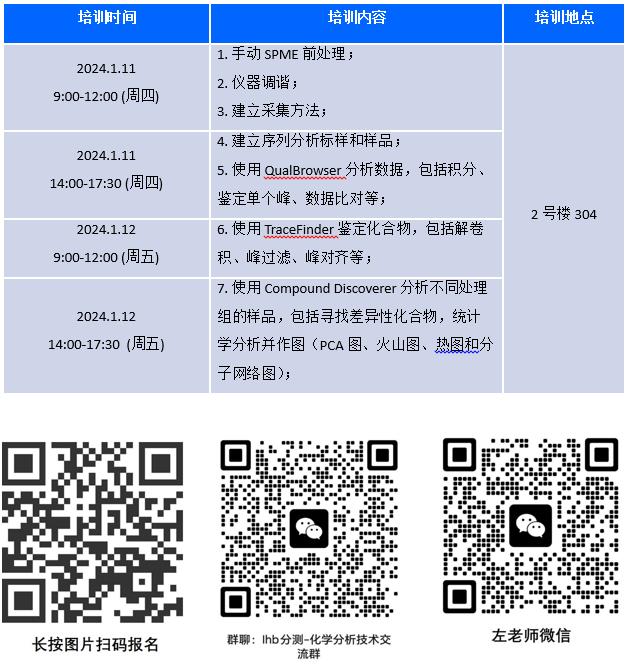 分析测试中心的“气相色谱-高分辨质谱仪(GC-HRMS)”用于鉴定分析挥发性和半挥发性有机化合物,可以用于未知化合物的鉴定和代谢组学的研究。为了满足科研团队对GC-HRMS的使用需求,化学分析技术平台拟于2024年1月11日和1月12日开展GC-HRMS的操作培训。本次培训旨在帮助科研人员学会仪器调谐、建立采集方法、建立序列分析样品、解卷积分析数据、统计学分析等。欢迎有一定GCMS基础的老师和同学参加。