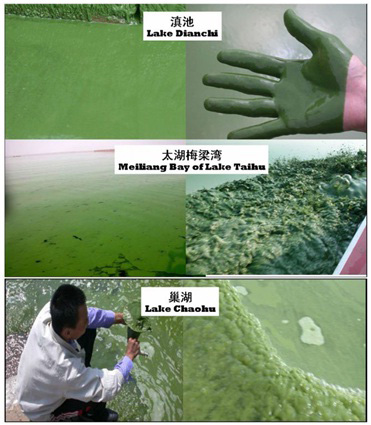 图1 壮观的蓝藻水华(滇池、太湖和巢湖)