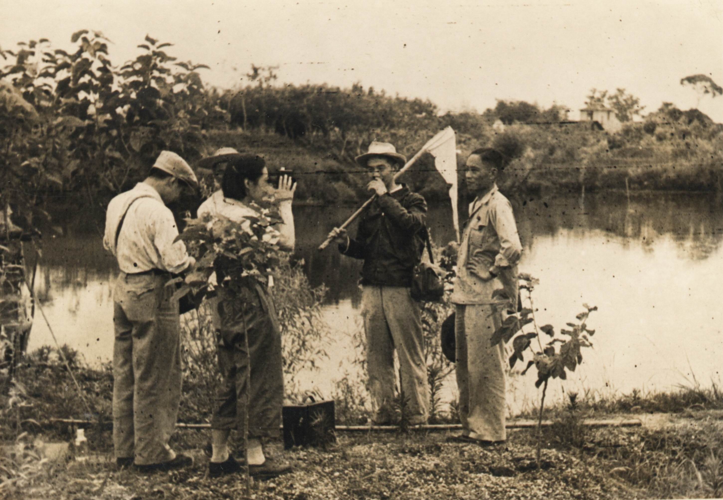右起饶钦止、黎尚豪、尹文英、黎功德(易伯鲁1950年摄于浙江菱湖南滨村鱼塘边)