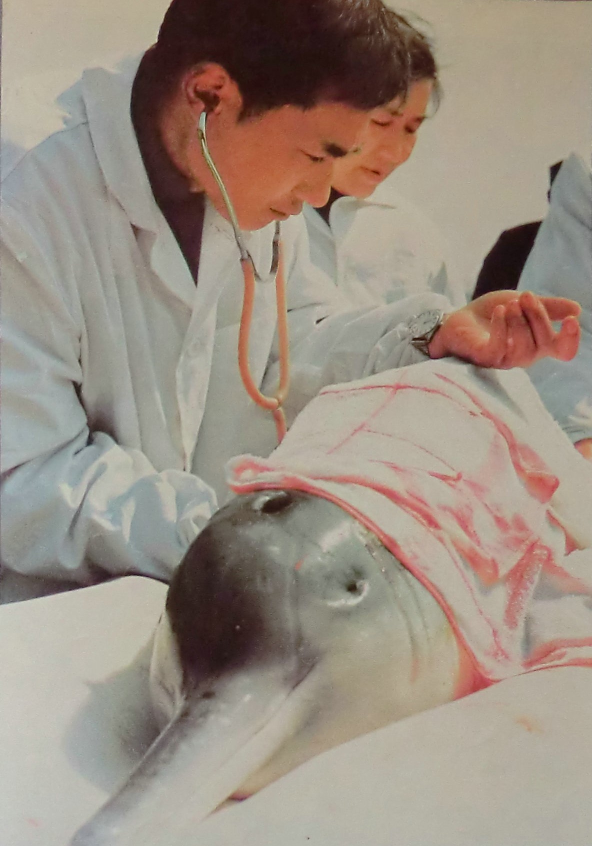 人民画报1980年,刘仁俊、陈佩薰正在为白鱀豚淇淇体检