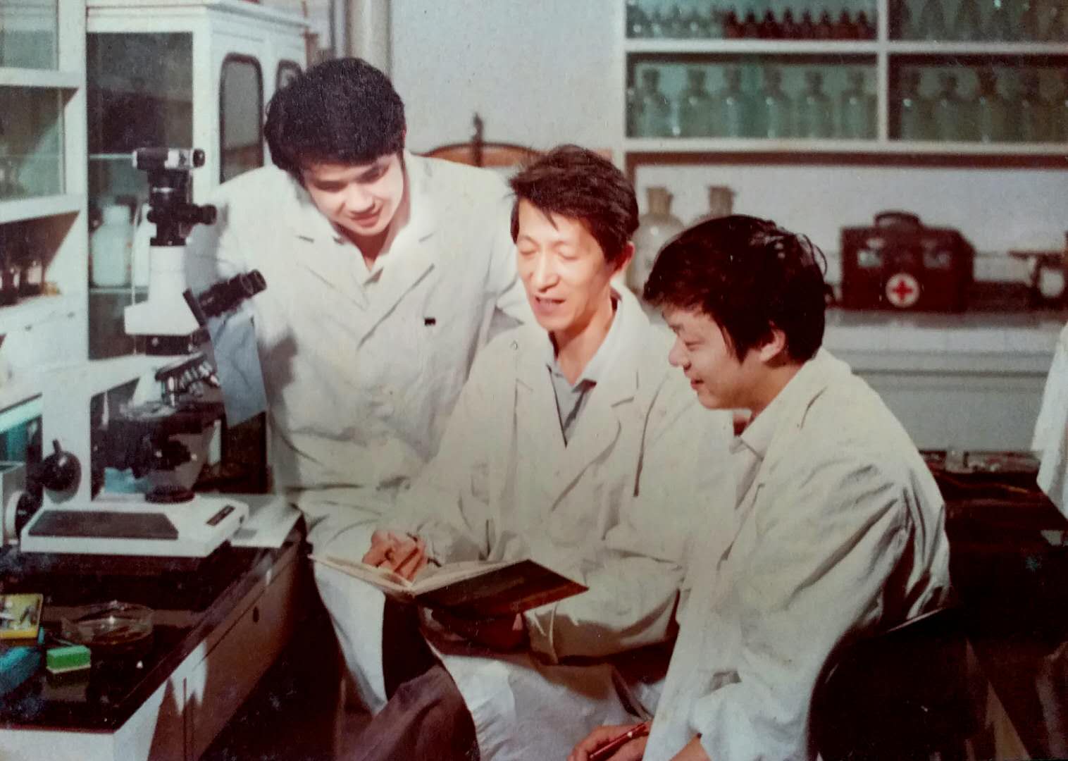 1989年5月水生所鱼病室王伟俊老师在实验室给组员冯伟和姚卫建指导工作