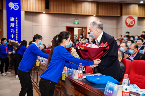 九十年华诞,开拓创新的精神代代相传。为了表达敬意,在大会现场,水生所朝气蓬勃的青年学子向在水生所工作40年以上的职工们献上鲜花和祝福。