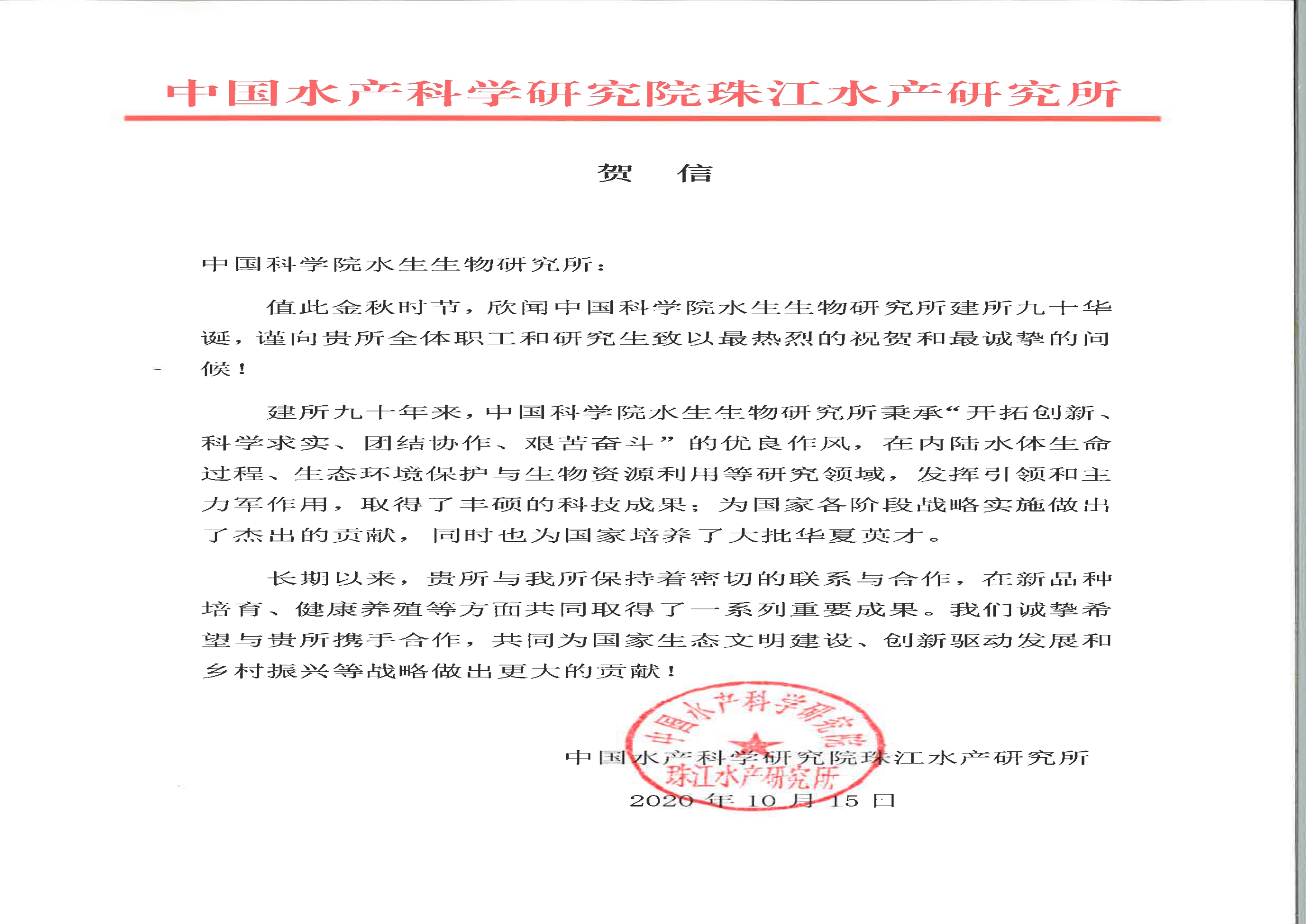 中国水产科学研究院珠江水产研究所贺信