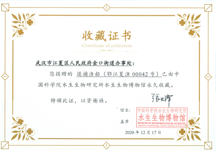 水生生物博物馆馆长张先锋研究员代表水生所接收该渔船及船名号牌和捕捞证,并向金口街道办事处颁发“水生生物博物馆收藏证书”。随后,该渔船被运往水生生物博物馆。