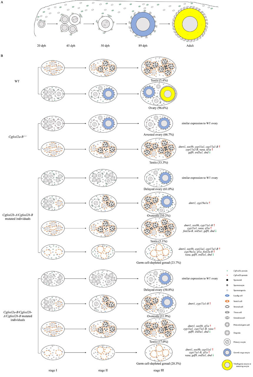 他们首先发现六倍体银鲫具有3个歧化的foxl2部分同源基因(Cgfoxl2a-B、Cgfoxl2b-A 和Cgfoxl2b-B),它们又各自具有3个序列高度一致的等位基因,而Cgfoxl2a-A在演化过程中已经丢失。Cgfoxl2a-B、Cgfoxl2b-A 和Cgfoxl2b-B均在生殖内分泌轴“下丘脑-垂体-性腺”呈现两性差异表达,且部分同源基因和等位基因都表现出偏向表达。CgFoxl2a和CgFoxl2b具有截然不同的细胞定位,除了在卵巢颗粒细胞和鞘细胞中表达外,CgFoxl2b还分布在原始生殖细胞和卵原细胞的核周。接着,他们采用CRISPR/Cas9技术分别或同时对这多个foxl2部分同源基因或等位基因进行编辑以损毁它们的功能,发现CgFoxl2a-B的缺失会以剂量依赖的方式导致卵巢发育停滞或性反转为雄性个体,且含有完整FKH结构域的Cgfoxl2a-B突变等位基因仍能激活Cgcyp19a1a-A 的表达;完全敲除Cgfoxl2b-A 和Cgfoxl2b-B 将导致不产生配子,尽管突变体中Cgfoxl2a-B的表达上调,但不能挽救缺陷表型;同时敲除Cgfoxl2a-B、Cgfoxl2b-A 和Cgfoxl2b-B 导致产生更严重的缺陷表型。