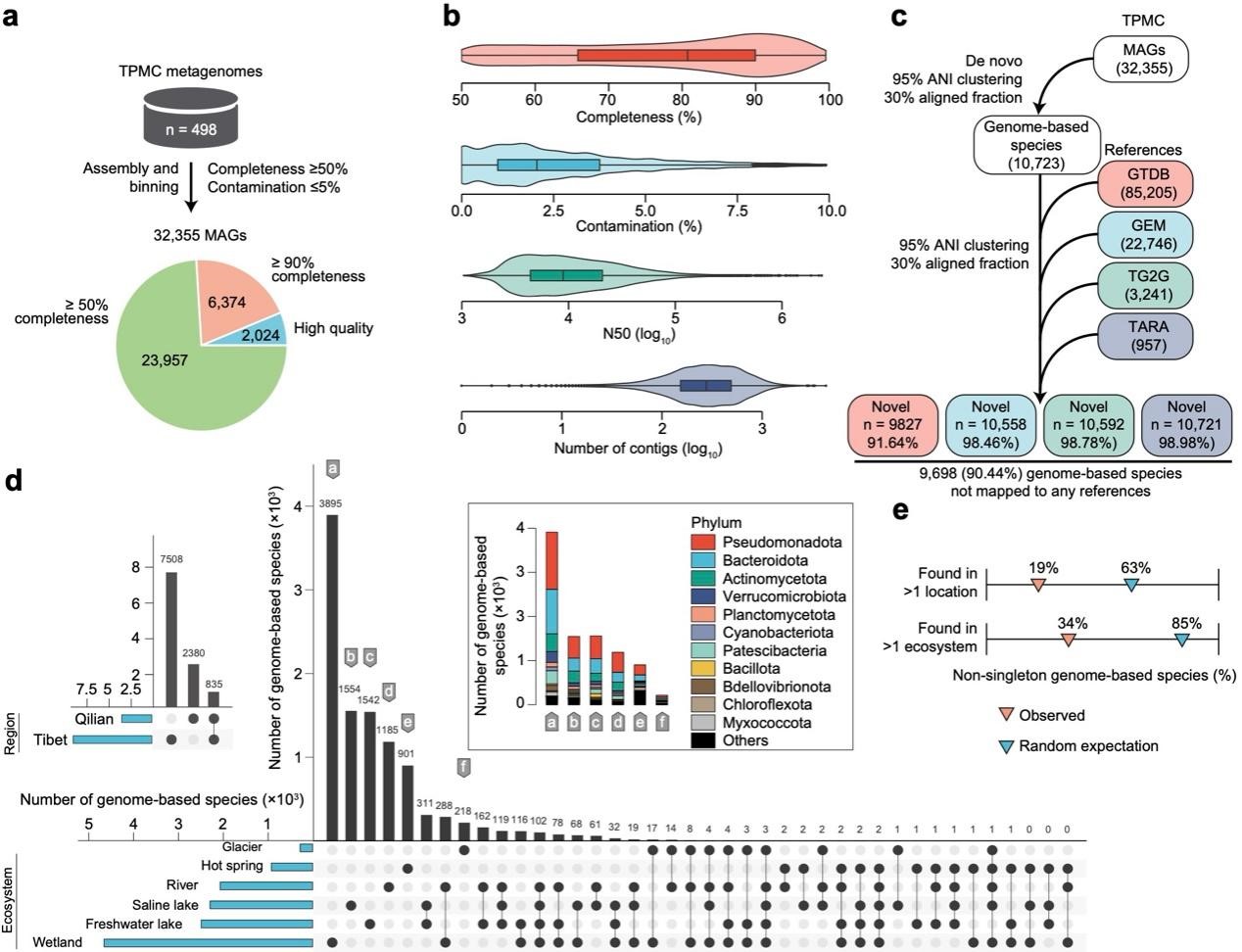 近日,中国科学院水生生物研究所缪炜研究员与华中科技大学宁康教授团队合作解析了青藏高原水生微生物基因组和基因目录。研究搜集了来自青藏高原湿地、淡水湖、盐水湖、河流、温泉和冰川的498个水体环境DNA样本并进行了宏基因组测序,初步建立了一个青藏高原水生微生物基因组和基因目录(Tibetan Plateau Microbial Catalog, TPMC)。TPMC目前包含了3万多个中高质量的原核微生物(细菌和古菌)宏基因组组装的基因组(Metagenome-assembled genomes, MAGs),聚类为1万多个物种,其中88%为未注释物种。除此之外,TPMC包含近3亿个非冗余基因,其中15%为新基因;7万多个生物合成基因簇,50%为新基因簇。这一结果表明青藏高原是全球微生物物种和遗传多样性的宝库。