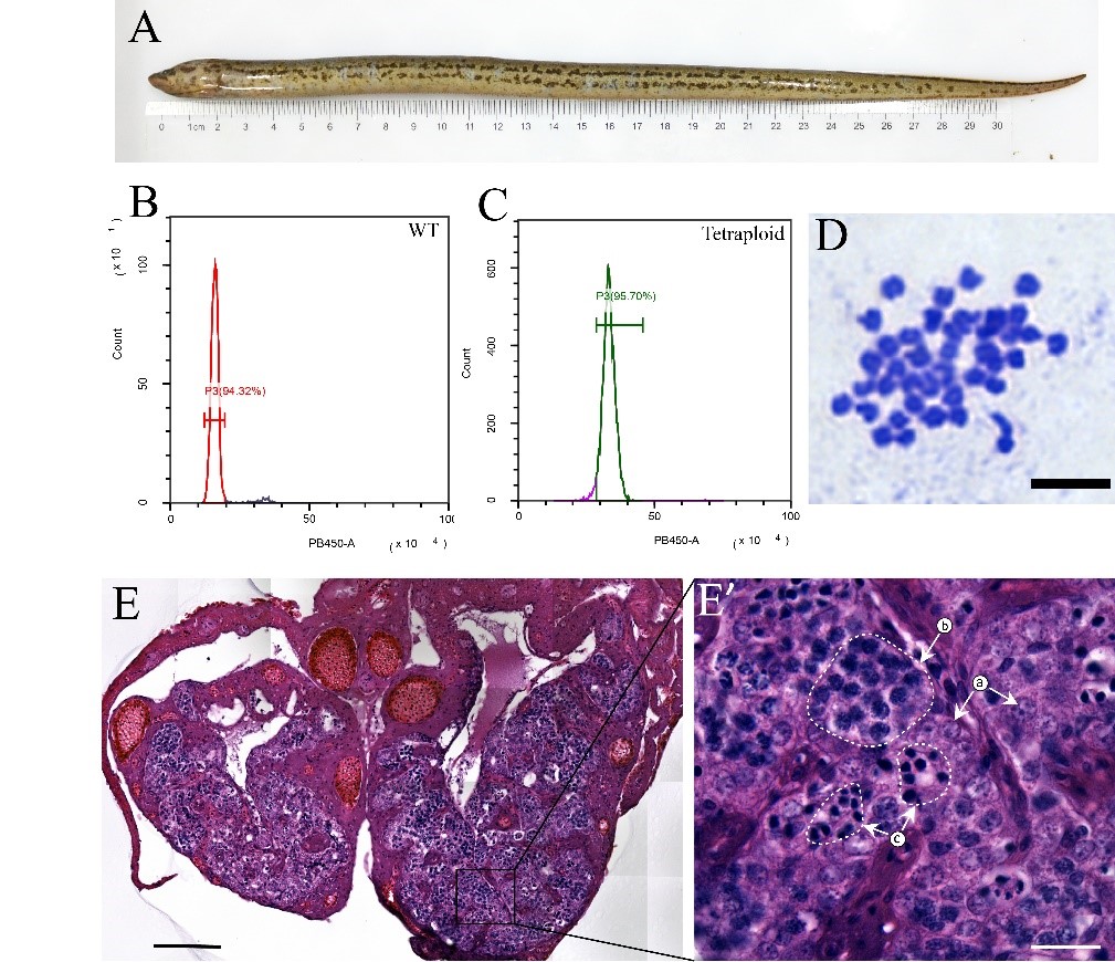 最近,团队通过静水压休克处理法抑制黄鳝第一次卵裂中期染色体分离,诱导染色体组加倍,建立了人工诱导黄鳝四倍化育种技术。静水压处理的黄鳝胚胎孵化率为4.70%,胚胎阶段检测四倍化率达到23.33%。人工诱导的四倍体黄鳝可以存活并发育为成体,流式细胞术检测体细胞DNA含量、染色体计数和血红细胞核面积分析等结果表明,采用该技术可以创制出四倍体黄鳝新材料。20月龄四倍体黄鳝性腺呈现精巢发育的特征,内部含有少量成熟的精子,可能具备生殖能力。人工诱导黄鳝四倍化技术为黄鳝遗传育种提供了新技术途径。近日,相关研究以“Hydrostatic pressure shock induced tetraploids in rice field eel (Monopterus albus)”为题在线发表于Aquaculture(https://doi.org/10.1016/j.aquaculture.2024.740636)。水生所蒋银军博士为该论文第一作者,胡炜研究员和宋焱龙项目副研究员为共同通讯作者。研究得到国家特色淡水鱼产业技术体系、国家自然科学基金、湖北省科技厅和农业农村厅等相关项目的支持。