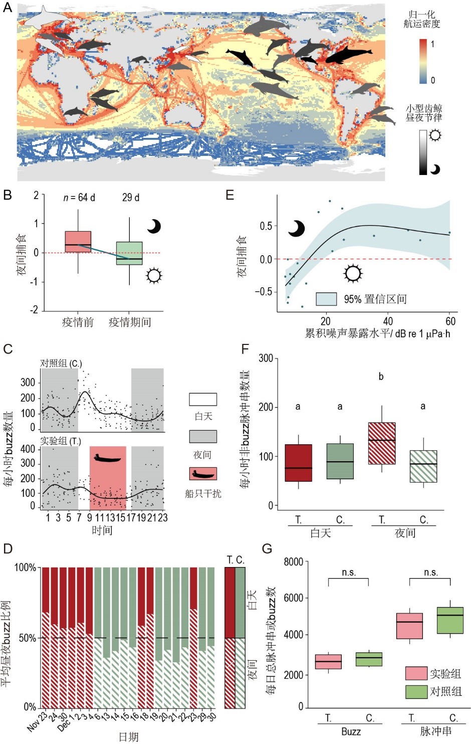 图(A) 小型齿鲸的昼夜节律和全球航运密度空间叠加,动物的喙端指向研究区域,白色代表昼行性,黑色代表夜行性。(B)比较疫情前(航运正常)和疫情初期(航运受限),野外长江江豚的昼夜捕食节律发生逆转(P = 0.018)。蓝色线连接疫情前和疫情初期长江江豚昼夜捕食节律的中值(>0代表夜间捕食,<0代表白天捕食)。方框代表数据范围的第一至第三个四分位数,轴须代表标准差。(C)在对照组中,长江江豚的整体捕食频率白天显著高于夜间(P < 0.001)。相比之下,在实验组中,长江江豚的整体捕食频率白天显著低于夜间(P < 0.001)。(D)这一趋势在三个对照和实验组周期中保持一致。(E)白天累积噪声暴露水平的增加导致了长江江豚捕食节律向夜间偏移(P = 0.002,Radj2 = 0.556,n = 19天)。(F)白天航运的存在导致长江江豚夜间捕食性的buzz脉冲串显著增加(P < 0.001)。(G)对照组和实验组每天的总脉冲串和buzz数保持一致。