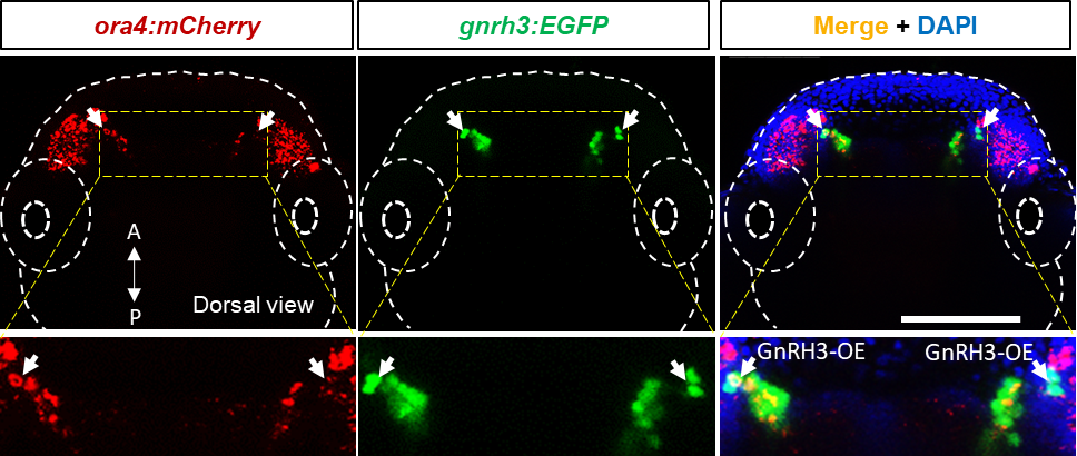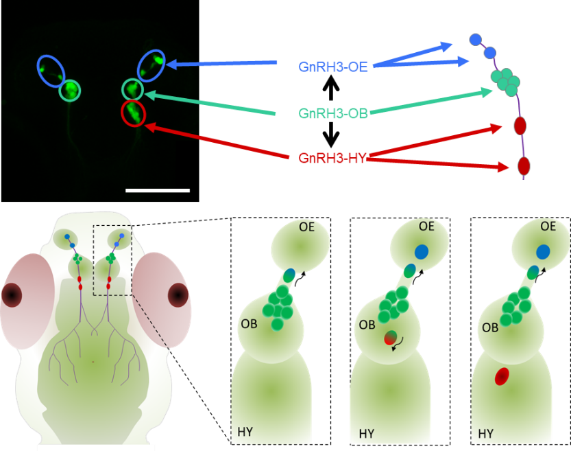 促性腺激素释放激素(Gonadotropin-releasing hormone,GnRH)是由GnRH神经元合成和分泌的生殖内分泌激素,是脊椎动物生殖轴的核心信号分子。嗅觉熟悉是引发鱼类求偶行为的关键,对于鱼类的繁殖非常重要。GnRH神经元具有嗅觉感知能力,GnRH神经元迁移紊乱会导致人类出现卡尔曼综合症引发嗅觉功能障碍和不育。然而,GnRH神经元感受嗅觉信号的机制尚不清晰,且现有认知无法解释其在嗅觉感知中的功能,GnRH神经元能否直接感知和传递嗅觉信号并调控求偶行为并不清楚。