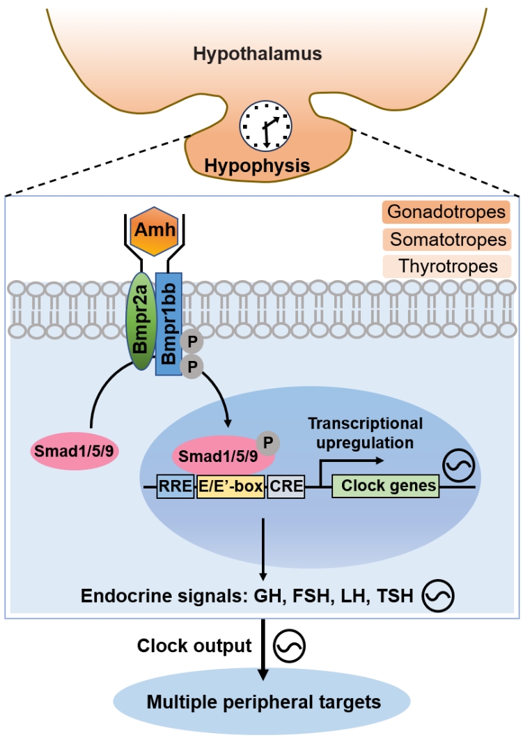 5月10日,中国科学院水生生物研究所水产品种创制与高效养殖全国重点实验室、华中农业大学、武汉大学等单位在国际学术期刊Nature Communications上发表了题为“Anti-Müllerian hormone signalling sustains circadian homeostasis in zebrafish”的研究论文,首次揭示一种内分泌因子Amh(Anti-Müllerian hormone)在生物钟稳态调控中的关键作用。Amh以细胞类型特异性方式调节垂体的分子时钟振荡,精确控制昼夜节律信息的输出,从而在组织和系统水平维持节律的一致性和生物钟稳态。Amh或其受体Bmpr2a的功能缺失会抑制分子钟振荡,扰乱内分泌和行为的昼夜节律,并影响多个外周组织的节律。在机制上,Amh与其受体Bmpr2a/Bmpr1bb结合,并招募Smad1/5/9蛋白,这些蛋白经磷酸化后转移至细胞核,通过结合多个生物钟调控元件(E/E’-boxes,RREs和CREs)调节时钟基因表达(图1)。这一突破性成果揭示了一种新的内分泌与时钟相互作用的分子机制,对于深入理解脊椎动物昼夜节律的神经内分泌调节和长期稳态具有重要意义,并可为鱼类的生长和抗逆等经济性状的遗传改良提供理论依据。