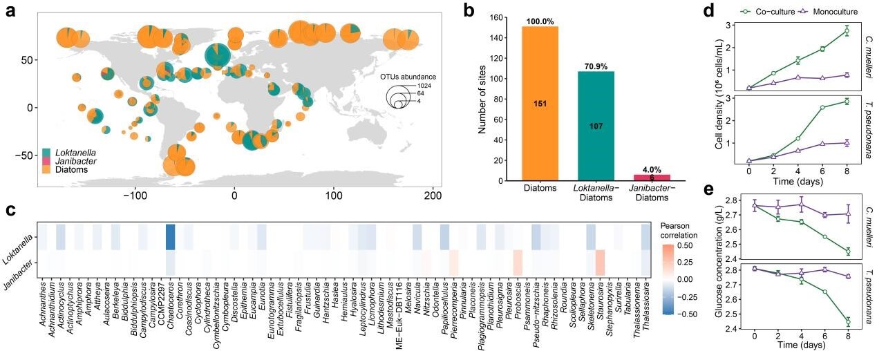 图2. 全球海洋中福尔山洛克式菌与硅藻的共现分析及硅藻与细菌共培养实验验证