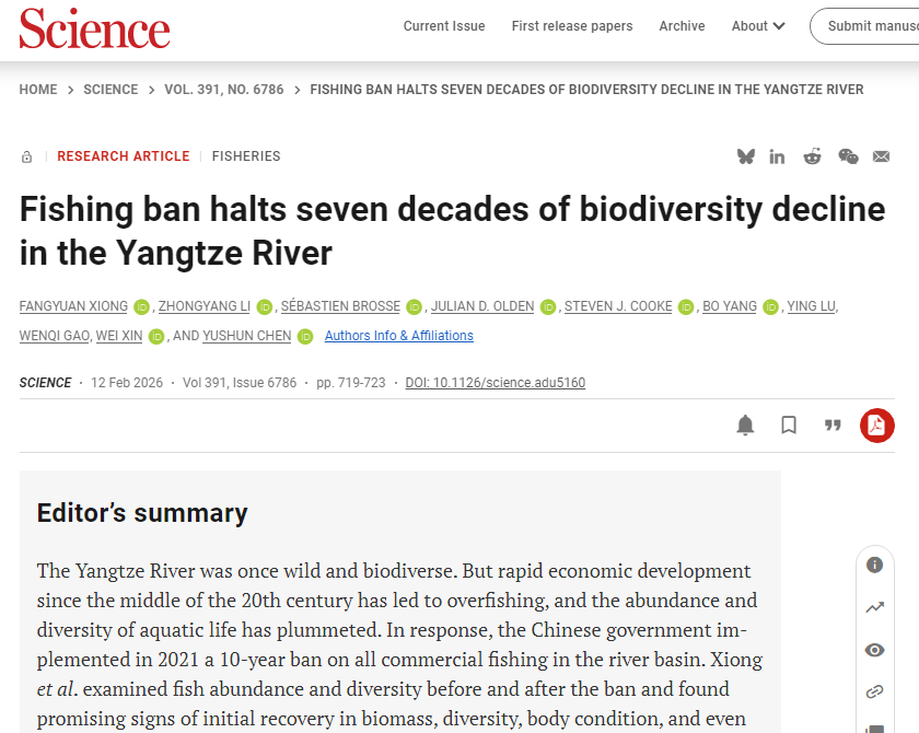 2月12日,《科学》(Science)在线发表了由中国科学院水生生物研究所联合湖南科技大学淡水与海洋生物与生态保护研究所主导的研究论文“Fishing ban halts seven decades of biodiversity decline in the Yangtze River”。该研究基于连续6年(2018-2023年)的系统性长期野外生态数据,从鱼类物种丰富度、生物量、丰度、均匀度及β多样性等多个角度,全面解析了禁渔实施前后长江干流鱼类群落的动态变化,并量化了水质、水文、气候变化、土地利用、岸线开发、航运及渔业捕捞等多重压力因子对鱼类多样性影响的生态学机制。