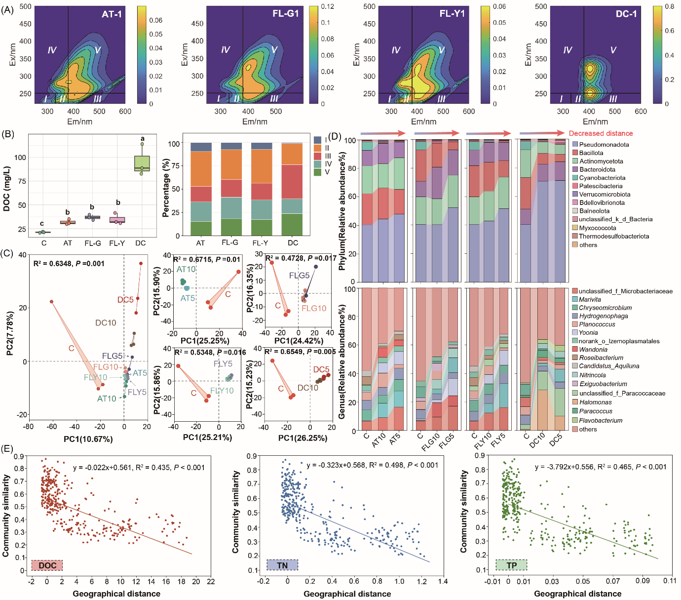 为阐明上述科学问题,中国科学院水生生物研究所吴辰熙研究员团队聚焦于贫营养湖泊-青海湖刚毛藻水华现象,综合野外调查与室内共培养实验,探究了不同形态刚毛藻(附着型、漂浮型和腐解型)相关DOM对其附生群落演化的调控作用,并重点分析了伴生种群落结构变化对湖滨带ARGs传播的影响。研究结果表明,刚毛藻藻际微环境在DOM释放与化学转化的驱动下,发挥着动态“基因孵化器”的功能。尤其在低氧衰亡阶段,DOM组成由易降解的蛋白质类物质向难降解的类富里酸物质转化。该DOM特征驱动了低多样性、高功能性的特定附生群落的富集,其中以不动杆菌属等细菌为优势类群。与高细胞密度促进水平基因转移(HGT)的预期相反,本研究发现藻际微环境中ARGs的增殖主要依赖垂直基因转移(VGT)。这一机制可解释为:DOM介导了对特定细菌宿主的选择性富集,其增殖进而促进了染色体相关耐药决定因子的传播。因此,藻际微环境积累了独特且高度富集的耐药基因组,而周围水体中的耐药基因组则具有更高多样性且主要由HGT过程主导。