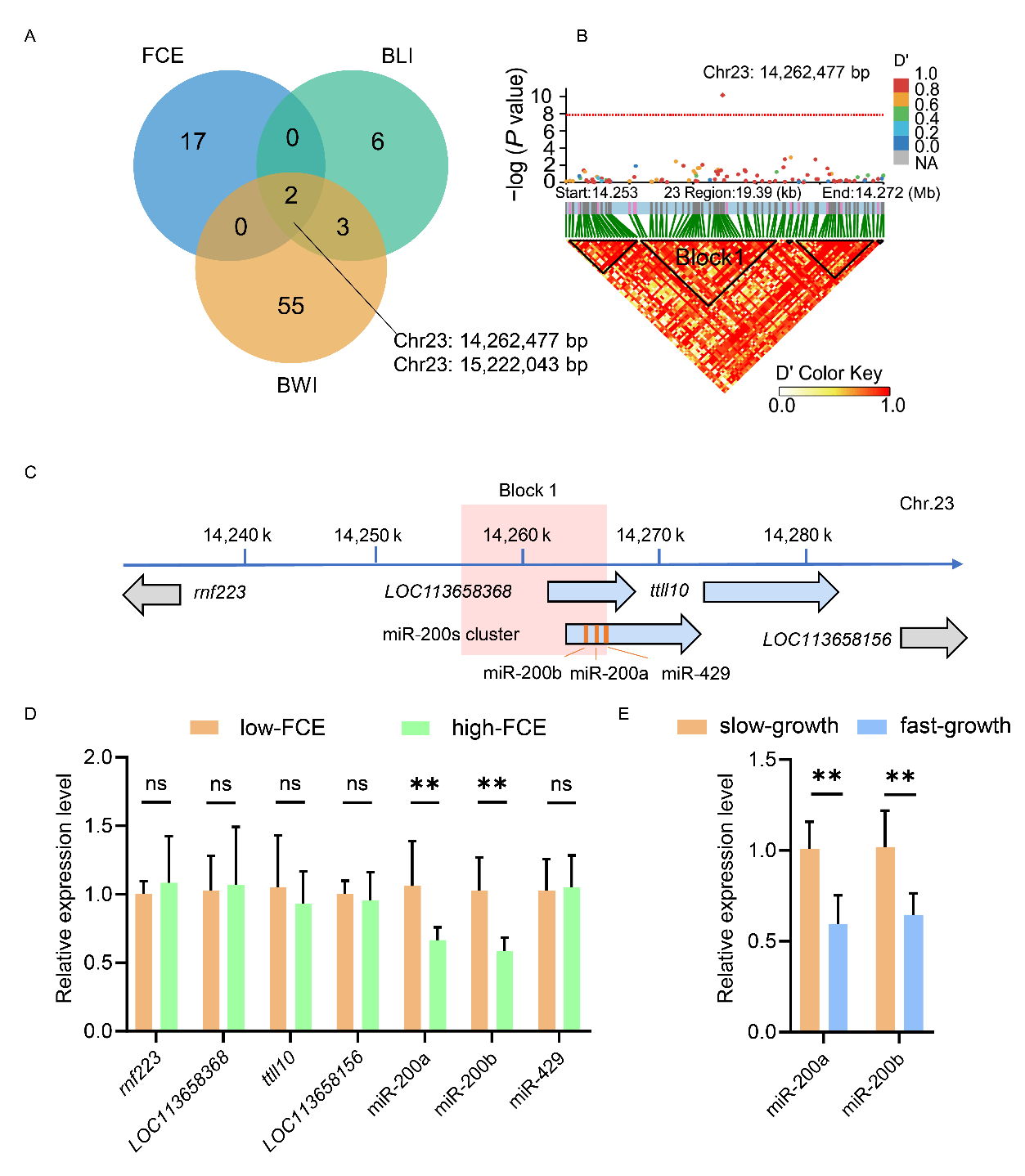 近日,中国科学院水生生物研究所梅洁研究员团队在黄颡鱼(Pelteobagrus fulvidraco)中揭示了miR-200a/200b-stat5b信号轴耦合调控生长与饲料转化率的分子机制。该研究首先选育了兼顾速生和高饲料转化率性状的黄颡鱼群体,并通过全基因组关联分析将关键位点定位于23号染色体miR-200基因簇附近,发现miR-200a和miR-200b在速生、高饲料转化率个体中显著下调(图1)。进一步构建黄颡鱼miR-200a/200b敲除纯合子,在平均摄食量无显著变化的情况下,敲除纯合子的生长和饲料转化率显著提高。结合TargetScan靶基因预测及miRNA-RNA pulldown及测序分析,鉴定出一系列与生长代谢相关的关键靶基因,如stat5b和fasn(图2)。其中,stat5b被证实为miR-200a/200b的核心靶基因,且stat5b转基因黄颡鱼的生长和饲料转化率均得到显著提升(图3)。该研究表明,miR-200a/200b主要通过作用于能量代谢相关靶基因和信号通路来调控营养利用效率,为解析高产与节粮性状的耦合调控机制及相关性状的精准改良提供了重要理论依据和技术支撑。