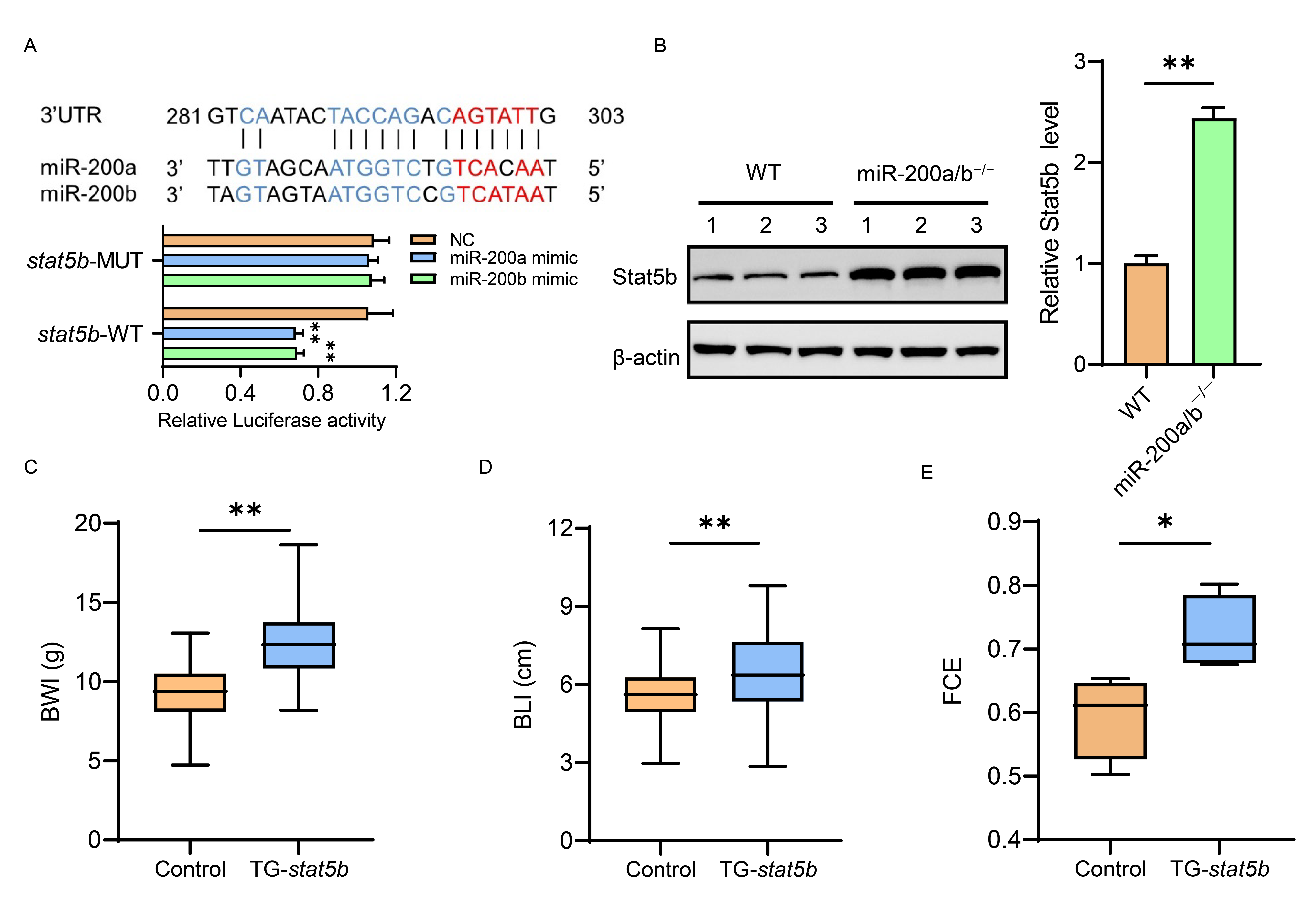 图3 miR-200a/200b通过靶作用stat5b调控黄颡鱼的生长与饲料转化率