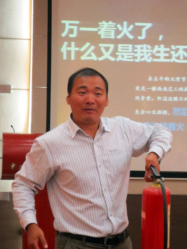 本次培训分为消防知识讲座和实地疏散演习两个部分。武汉市防火中心主任杨威为大家作了“让生命远离火灾”为主题的消防知识讲座。通过一个个触目惊心的鲜活案例,杨老师警醒同学们要提高消防安全意识,强调学习消防知识的重要性。他还特别强调,火灾重在防范意识,“防患于未然”是最要紧的。讲座中,杨老师为大家介绍了九大家庭救生消防工具:灭火器、强光手电筒、收音机、斧头、防毒防烟面具、烟感器、燃气泄露报警器、5公斤清洁水源、止血绷带。他还为大家详细介绍了灭火器及防毒防烟面具的使用方法。