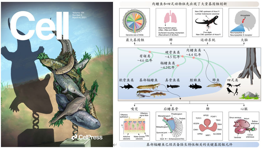 4亿多年前脊椎动物从水生到陆生是包括人类在内的陆生脊椎动物演化史上的重大事件,但长期以来对这一重大事件的遗传创新机制知之甚少。水生所何舜平团队与西北工业大学生态环境学院王文、王堃团队和昆明动物所张国捷等团队合作,发现硬骨鱼祖先已进化出了陆生适应性相关的初步遗传基础,在肺鱼代表的肉鳍鱼内得到进一步加强,到四足动物最终完善而成功登上了陆地。Science报道该成果揭示了“隐藏在现生鱼类中水生到陆生演化的遗传奥秘”。瑞典科学院院士Per Alhberg教授撰文指出该项成果克服了化石研究难以研究软组织器官和生理学问题的挑战。美国科学院院士、国际著名脊椎动物登陆研究专家Neil Shubin撰文指出该成果为理解脊椎动物水生到陆生的研究“提供了关键认知和长久期待的数据”。该成果两篇研究论文以封面故事发表于《细胞》杂志(Cell,2021,184(5):1362-1376;1377-1391)