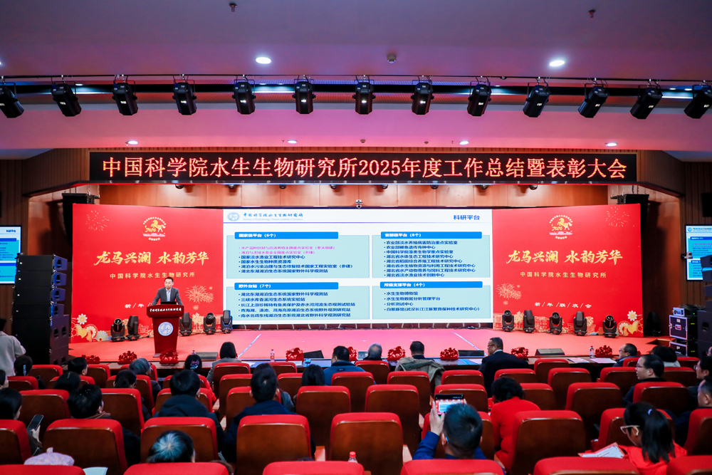 2月11日,中国科学院水生生物研究所举办2025年度总结表彰大会暨2026年新年联欢会。曹文宣院士、桂建芳院士,所长缪炜,党委书记、副所长解绶启,党委副书记、纪委书记梁琼,副所长徐军,以及在职职工、离退休职工和研究生代表等300余人欢聚一堂,共忆2025年奋斗征程,共绘2026年发展蓝图。