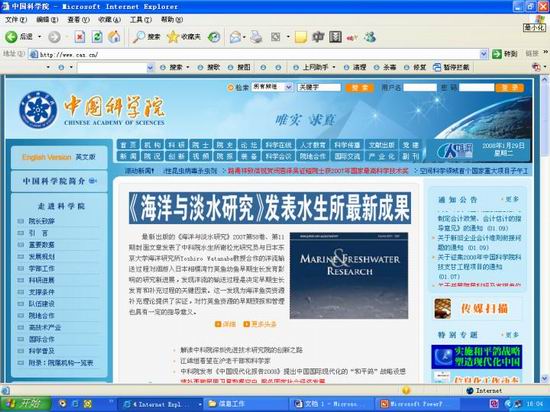 中科院网1月29日将“《海洋与淡水研究》发表水生所最新成果”列为头条信息发布