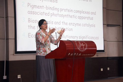 陈敏教授致力于研究储能反应和光合生物光调控过程的分子和生化机制的研究。在此次创新讲座中,陈敏教授介绍了她对蓝藻藻胆体和叶绿素蛋白的光合作用机理的研究进展,以及发现叶绿素f的过程,并图文并茂地展示了叶绿素f吸收光谱红移的特性。在早先就有研究者发现,在一个群落的空间结构分布中,处于阳光照射面的光合作用生物往往富含吸收可见光的叶绿素a、叶绿素b,而处于下层的光合作用生物接受的可见光光照有限,富含叶绿素d的深海单细胞蓝藻Acaryochloris marine正是在这样的空间结构中被发现的,这种蓝细菌可吸收红外光。陈敏教授将野外采集的微生物在单色光照的环境下培养,得到了可利用红光生长的光合生物,并发现了其中新型的叶绿素f。相对于叶绿素d,陈敏教授发现的叶绿素f具有更强的红移吸收峰,更能使光合生物的吸收光谱加宽,从而有效提高光合效率。陈敏教授的发现将对其它光合植物进行提高光合效率的改造有重要参考价值。