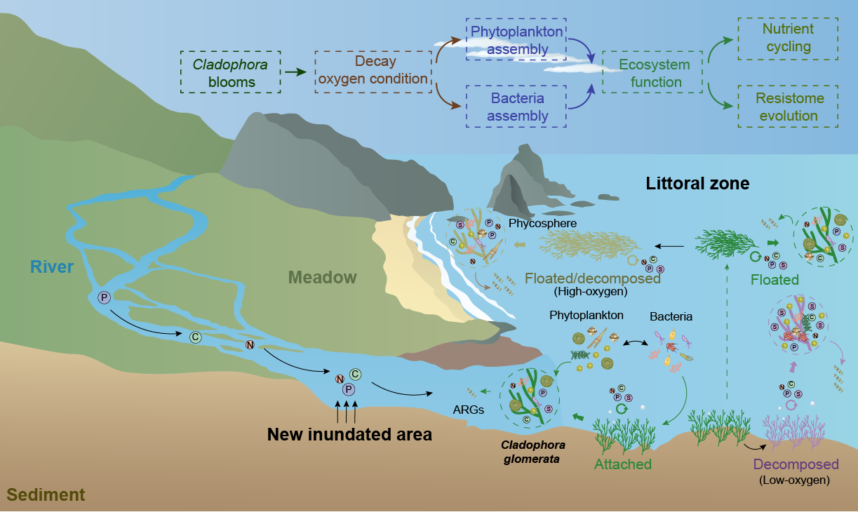刚毛藻作为水生生态系统的重要底栖初级生产者,其与细菌的复杂关系不仅影响水生生态系统的平衡,同时也驱动抗生素抗性基因(Antibiotic resistance genes, ARGs)的传播与演化。尽管前期研究已证实藻际微环境是水环境ARGs赋存与扩散的关键生态位,然而在自然条件下,刚毛藻不同生活阶段依赖性溶解性有机质(DOM)释放如何调控藻际附生浮游植物与细菌群落的组装过程、藻-菌互作模式及其介导的抗性组动态,目前仍缺乏系统认识。