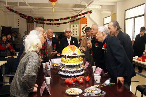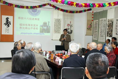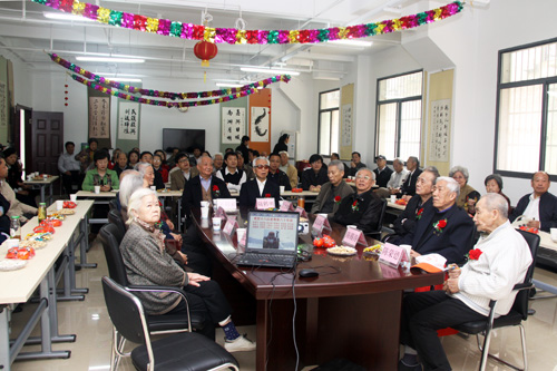18位寿星中的11位来到了祝寿活动现场。通过大屏幕上一张张发黄的老照片,展示了水生所1954年从上海迁至武汉60年来的风雨历程和沧桑巨变,展现了寿星们与水生所共同成长的光辉岁月以及代代相传的水生所精神。照片中一张张青春朝气的脸庞如今已白发苍苍。所领导赵进东、胡征宇、解绶启、徐旭东、杨兴宪依次送上祝辞,感谢寿星们对水生所发展的各个阶段所做出的贡献,离退休老同志是水生所的宝贵财富,希望他们一如既往地支持和关心水生所的发展,祝愿他们福如东海,寿比南山。来宾们通过歌咏、诗赋、书画等形式为寿星们送上了深深的祝福。